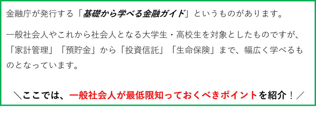 2022年4月~高校での「金融教育」がスタートしました。これから金融知識を持った学生が社会に出てきます。これまでは、家庭や学校で金融に関する知識を身に付ける場が少なく、お金について詳しく知らず社会人になった人が多いと思います。ぜひ早めに正しい金融知識を身に付けておきましょう。